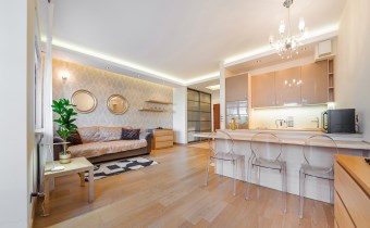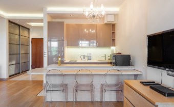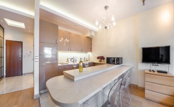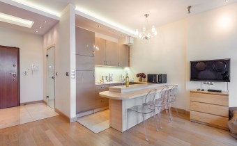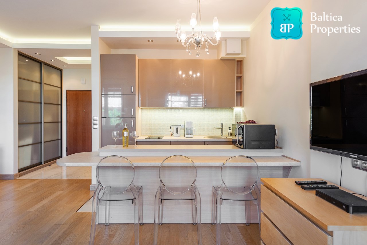 Apartament w pełni umeblowany o wysokim standardzie widocznym na zdjęciach.