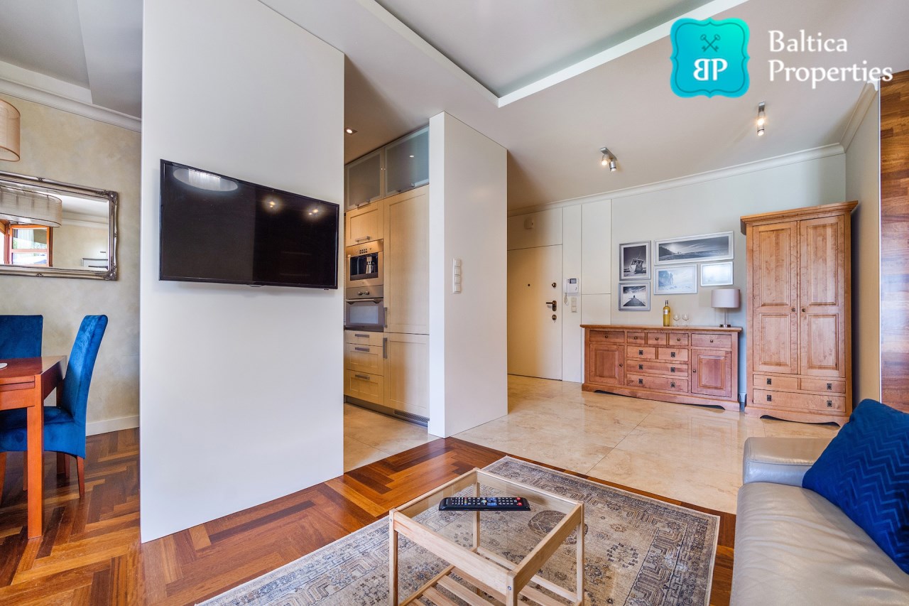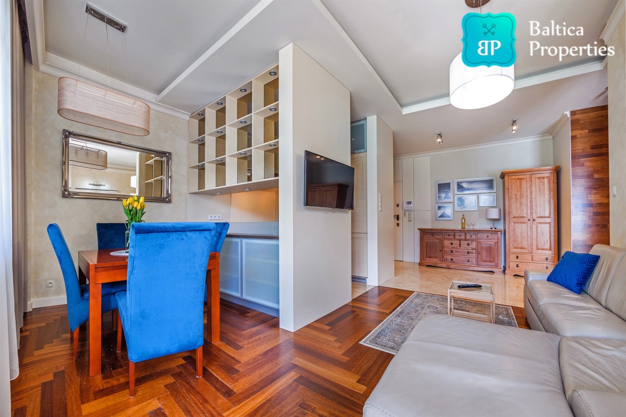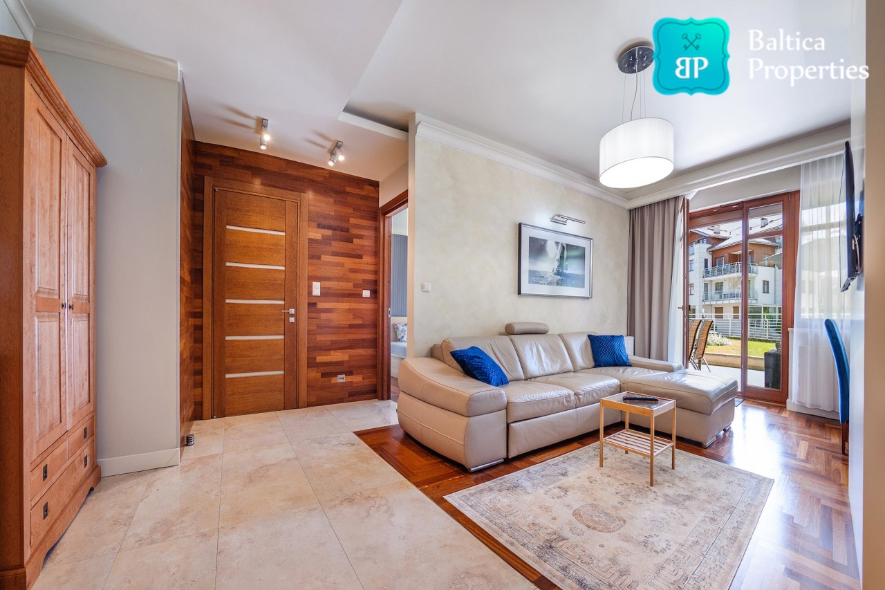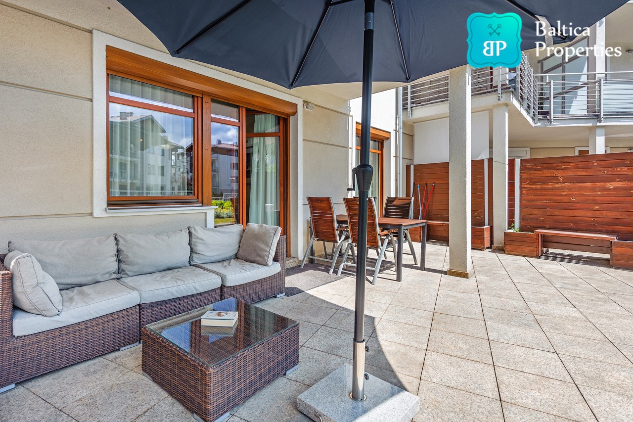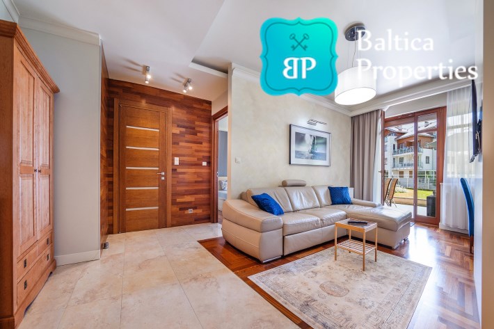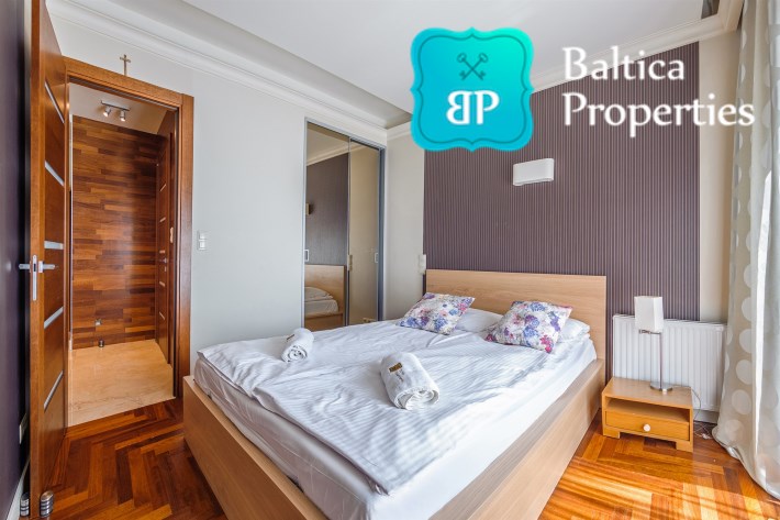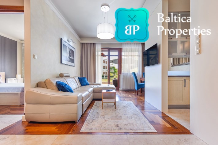 Na wynajem luksusowy dwupokojowy apartament "SUNSHINE&TERRACE" o powierzchni użytkowej 50m2 zlokalizowany w luksusowym kompleksie Neptun Park w odległości 100m od plaży w Jelitkowie tuż przy promenadzie.Apartament składa się z następujących pomieszczeń: