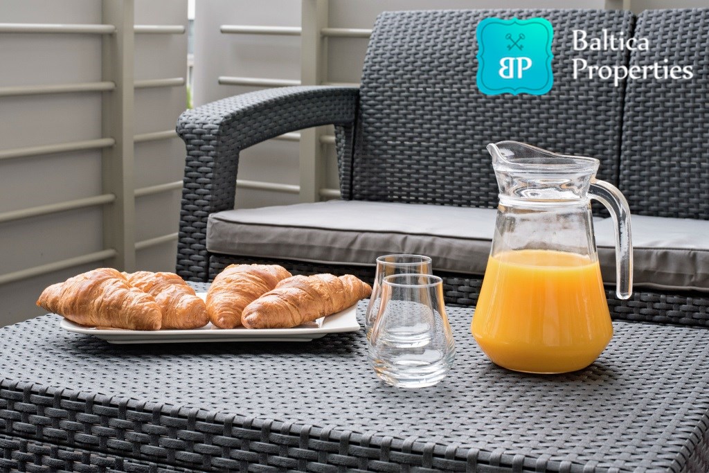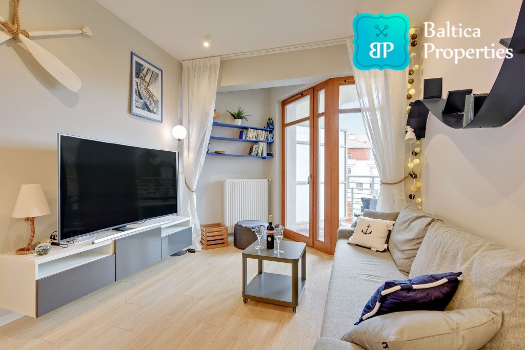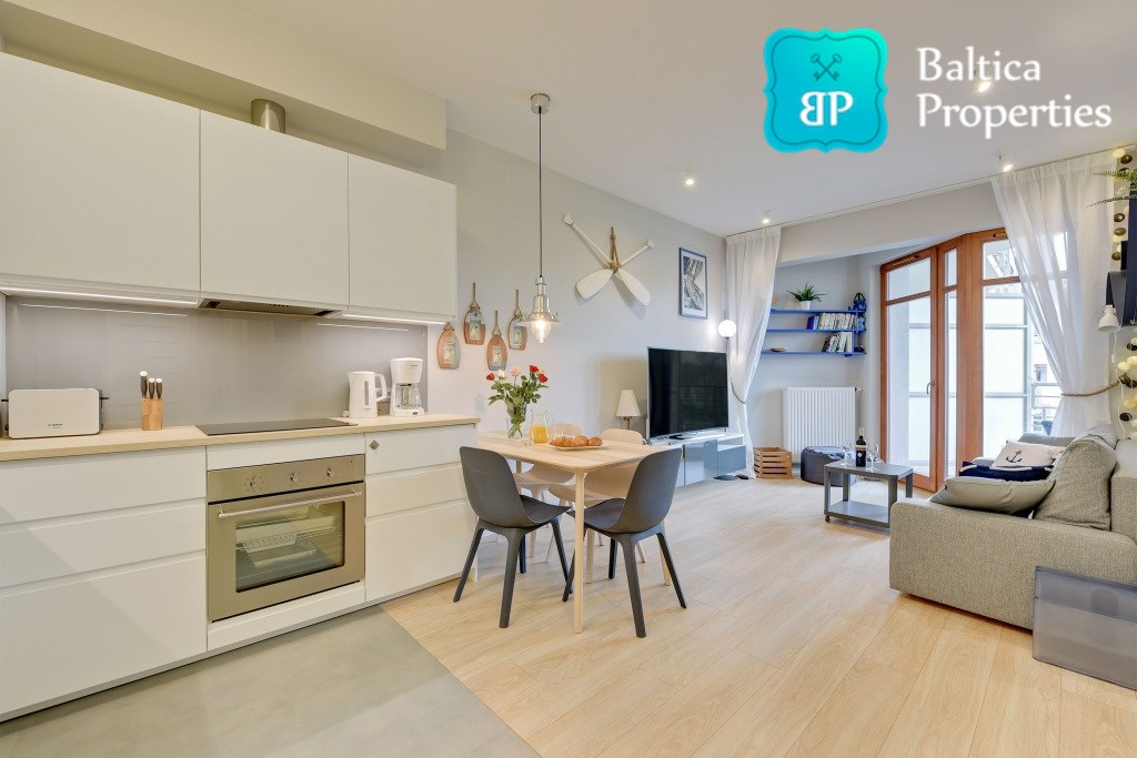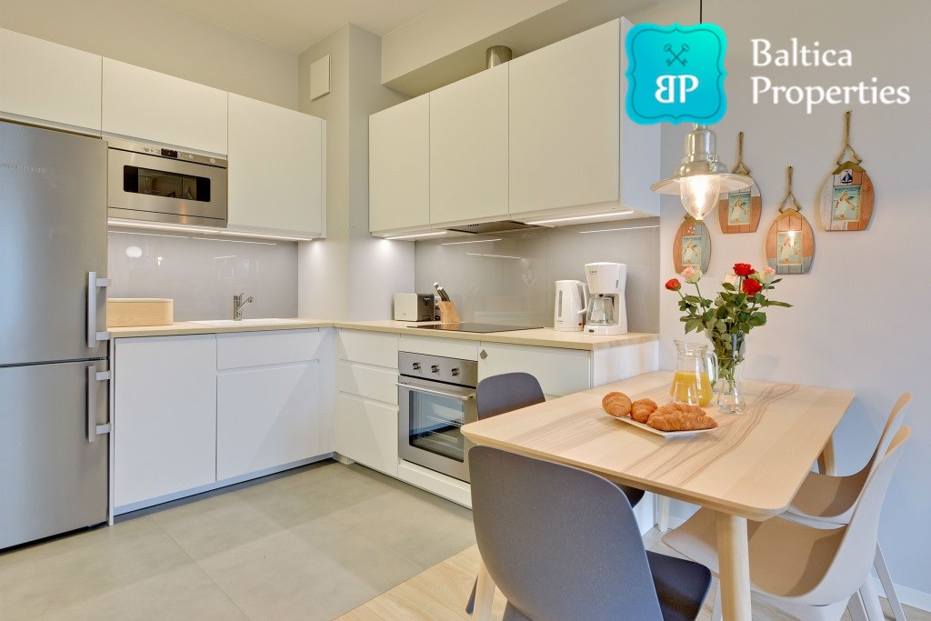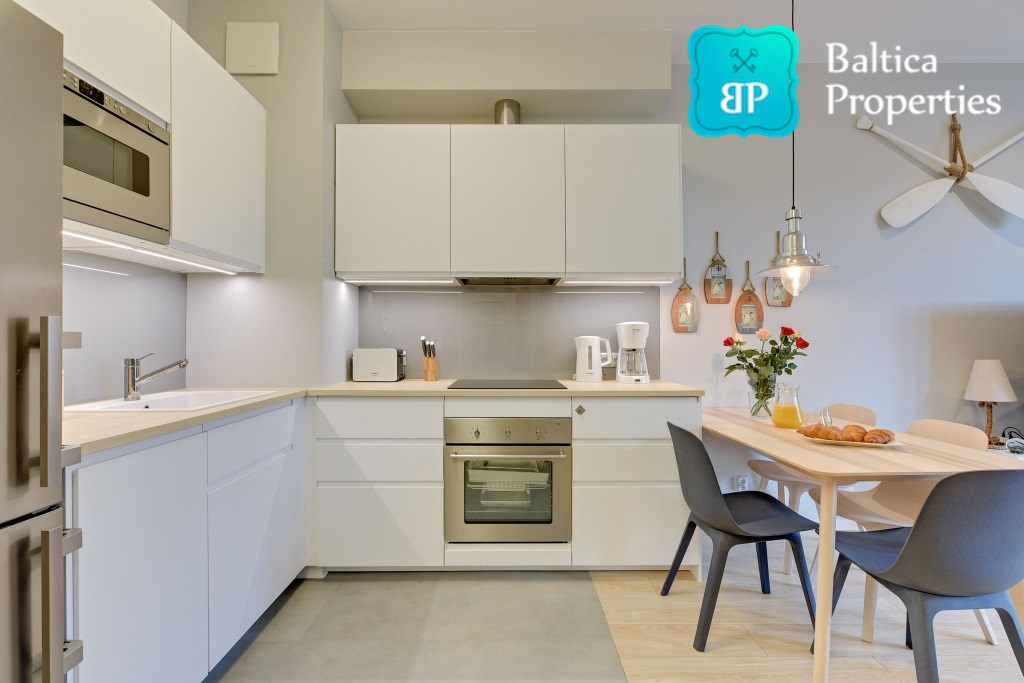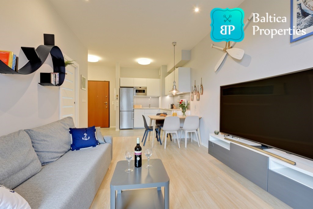 Apartament w pełni umeblowany o wysokim standardzie widocznym na zdjęciach.
